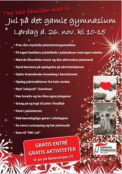 I år gentager gymnasiet succesen lørdag den 26. november kl. 10-15, hvor der – lige som sidste år – er masser af julehygge og sjove aktiviteter. Men i år er julemarkedet bl.a. udvidet med ”VM i jul” og ”Juleloppen”, hvor elever og lærere sælger ud af gemmerne, og man kan få den bæredygtige advents- eller julegave i hus.