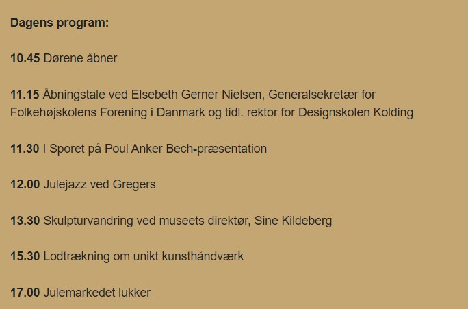 Har man lyst til en ekstraordinær kunstoplevelse kan man efterfølgende, på museets første sal, få en kort introduktion til formidlingsprojektet I sporet på kunsten, der denne dag tager udgangspunkt i kunstneren, Poul Anker Bech. Ud på eftermiddagen er der mulighed for at deltage i lodtrækningen om unikt kunsthåndværk, oplevelser og gavekort, leveret af dagens standholdere.