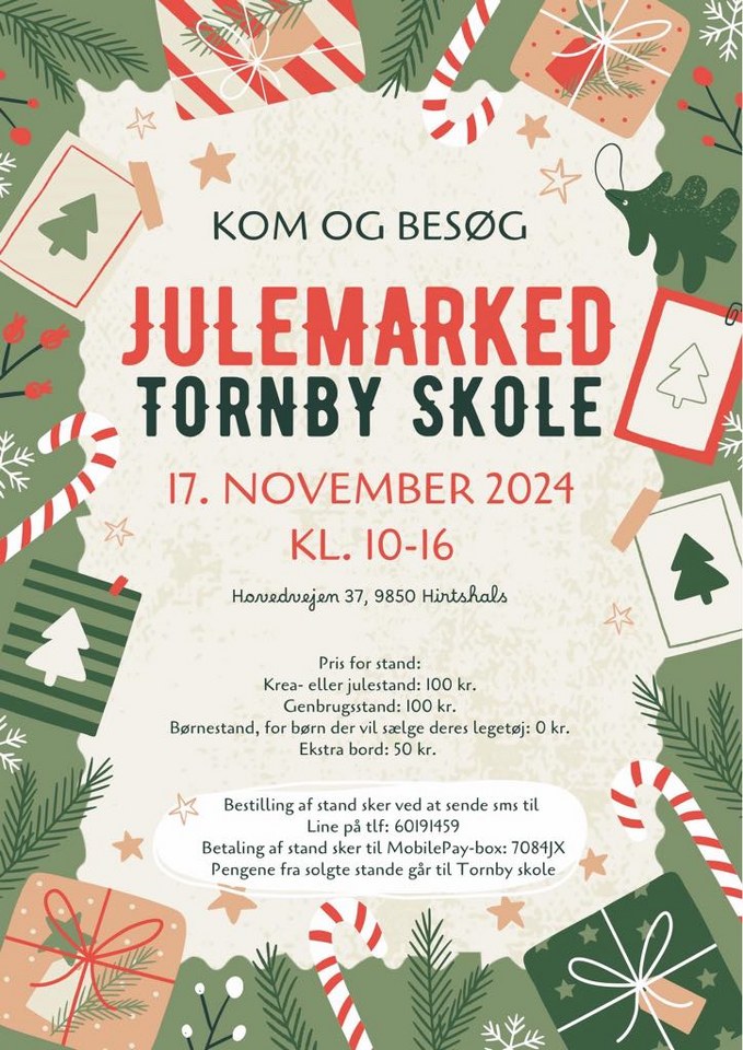 Aktivitetsudvalget på Tornby Skole gentager succesen fra sidste år og afholder den 17. november kl. 10 til 16 igen i år julemarked på Tornby Skole.