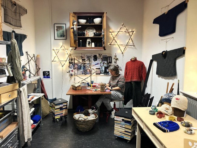 I vævestuen sidder også Eldrid, som spinder uld fra sine egne alpakaer på en elektrisk spinderok. Eldrid tager noget af sit garn med til julemarkedet, hvor man også kan besøge værkstedet og opleve de imponerende væve i brug.