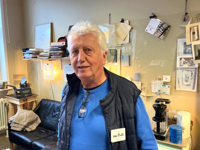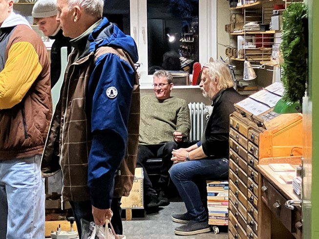 Jes Bonde Nielsen indbinder bøger, laver guldtryk og fortæller gerne om sit håndværk. Til julemarkedet kan du bl.a. købe notesbøger, skitsebøger og en særlig juletraditionsbog.
