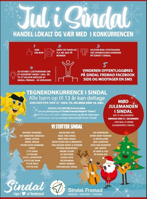 Julen i Sindal byder også på en tegnekonkurrence for børn op til 13 år. Konkurrencen løber fra 27. november til 16. december, og der er mange gevinster på spil – blandt andet en oplevelse med Sindal Fremads maskot “Solen”. Tegningerne afleveres ligeledes ved Sparekassen Danmark.