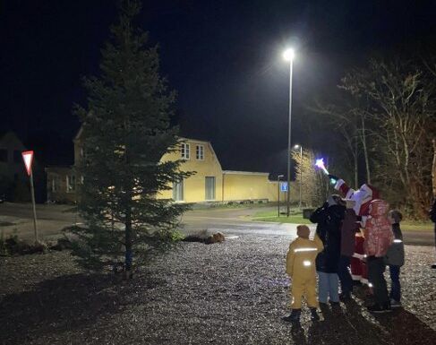 Julemanden arriverede med fuld musik og talte ned fra 10, hvorefter det smukke træ blev oplyst. Julemandens stemme mindede påfaldende meget om Kaj Petersens, da han gik rundt blandt børnene og delte chokolade ud.