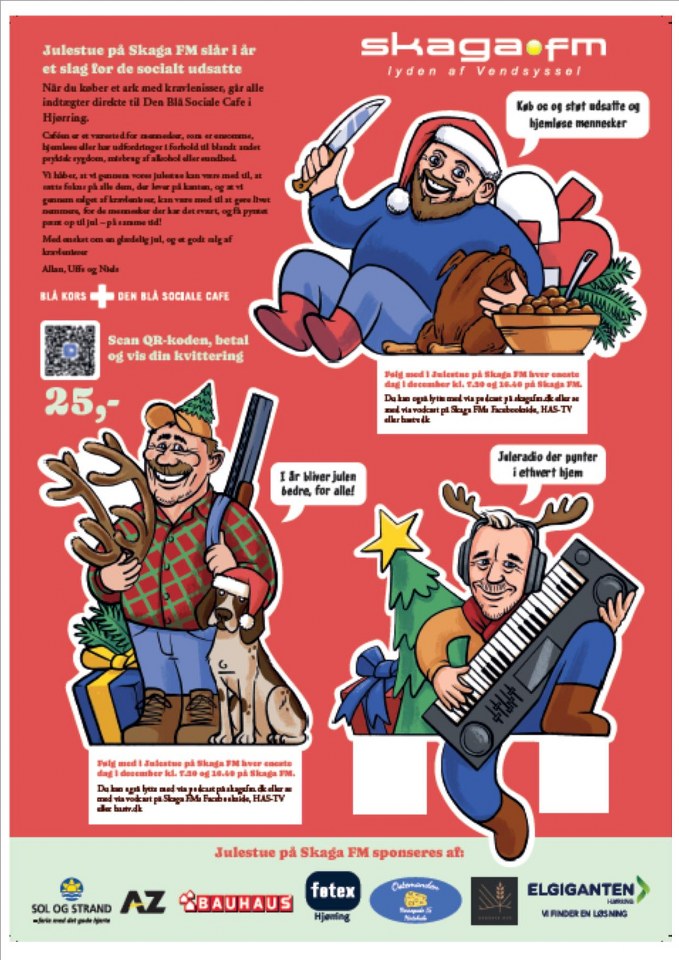 ”Julestue på Skaga FM er 5-6 minutter hver dag i december, hvor man lige kan få Jule-pulsen lidt ned. Det er God gammeldaws Juleradio i lyd og billeder, hvor vi hver dag kredser os om et bestemt fokuspunkt. Vi snakker blandt andet om Juletraditioner, Mandelgaver, ensomhed, Juleønsker, madspild og Gavetips. Vi smager på Årets Bjesk, samt Juleost og Champagne fra Ostemanden i Hirtshals. Vi får besøg af Christiane fra Kornets Hus. Hun har lækkert Julebagværk med i studiet, og mon ikke der hører en lille historie og lidt musik til hver Julekage? Apropos musik – så har vi jo også vores Musik-lykkehjul, hvor vi hver eneste dag finder ud af hvilken kendt julesang vi skal slutte dagens afsnit af med”, uddyber Niels Viberg fra Skaga FM.