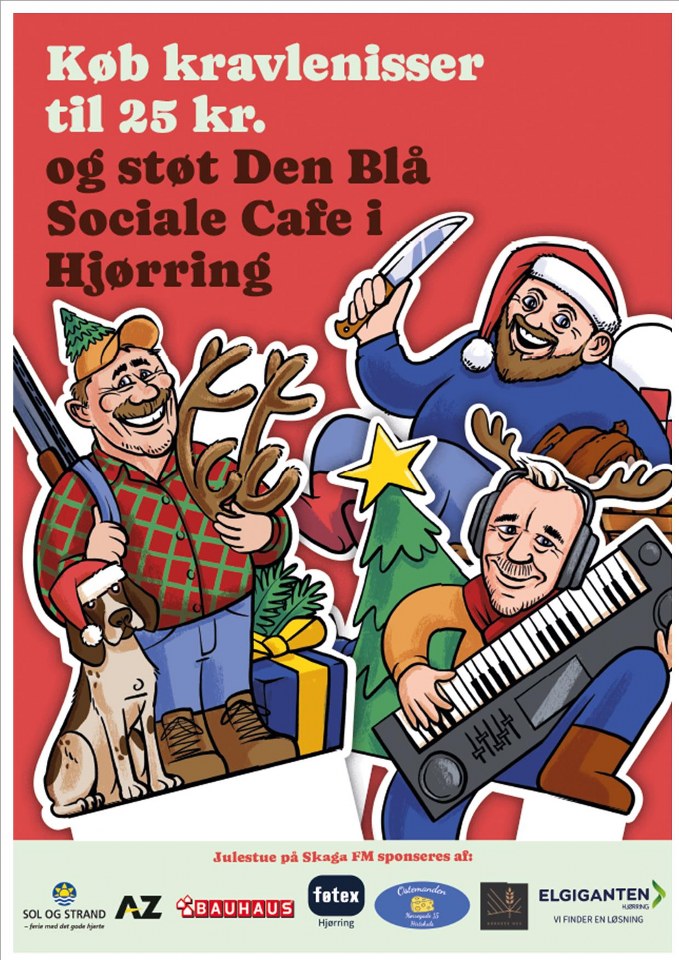 ”Julestuen slår i år et slag for de socialt udsatte. Vi har nemlig fået dygtige Thomas Iburg fra Iburg Illustration, Grafisk Design og Animation til at tegne os som Kravlenisser. Det er stort at udkomme som Kravlenisse… Når du køber et ark med kravlenisserne, så går alle indtægter direkte til Den Blå Sociale Cafe i Hjørring. Cafeen er et værested for mennesker, som er ensomme, hjemløse eller har udfordringer i forhold til blandt andet psykisk sygdom, misbrug af alkohol eller sundhed. Vi håber, at vi igennem vores Julestue kan være med til at sætte fokus på alle dem, der lever livet på kanten, og at vi gennem salget af vores Kravlenisser kan være med til at gøre livet bare lidt nemmere, for de mennesker der har det svært, og få pyntet pænt op til jul – på samme tid.