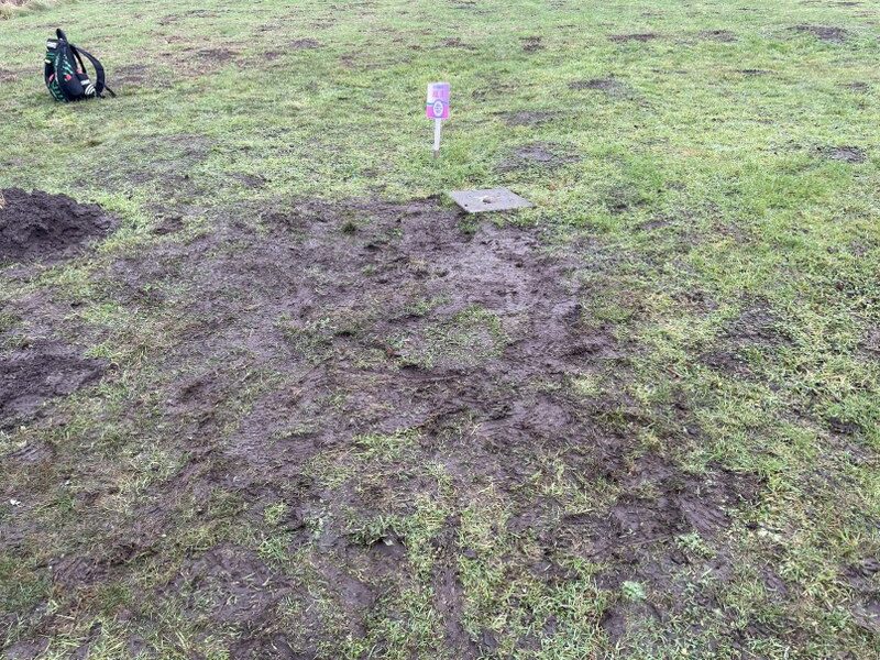 Det havde regnet meget om natten og gjorde det også op ad formiddagen. Så det var en smattet affære. Heldigvis havde et arbejdshold fra Vrå Disc Golf i samarbejde med IdrætsCenter Vendsyssel og Hjørring Kommune fået skaftet en bunke flis.