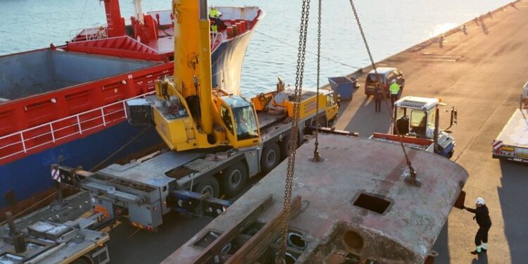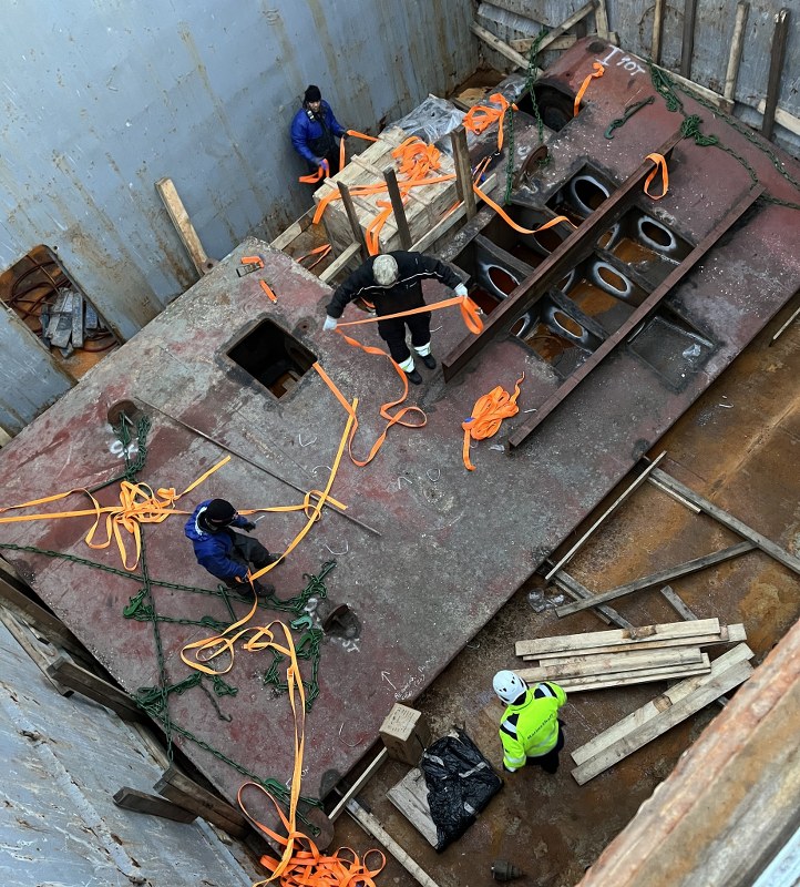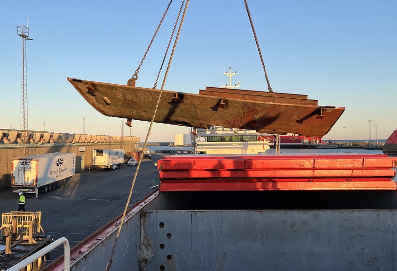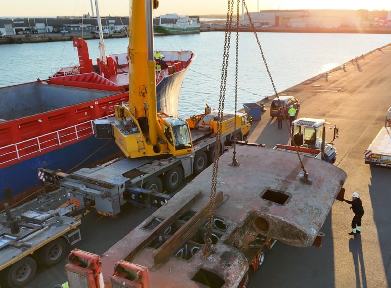Alligevel løftede især nysgerrige forbipasserende på havnen nok begge øjenbryn, hvis de mandag morgen var så heldige at få et kig på det 40 tons tunge ror, der blev løftet op på Sildekajen.