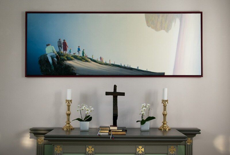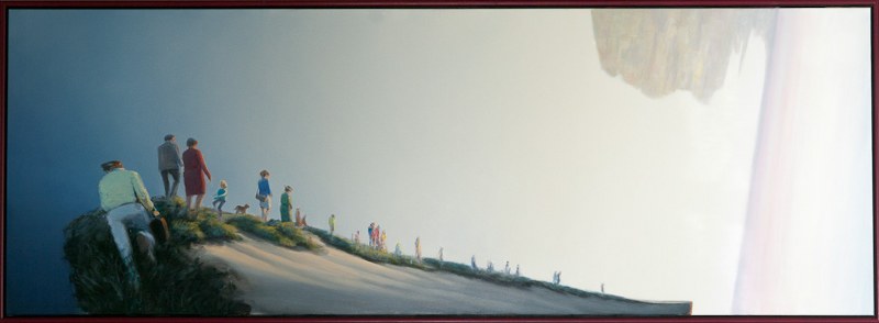 “Motivet er mennesker på livets kant. De går let og afslappet som på en søndagstur uden at ænse, at menneskelivet altid leves ude på kanten, hvor afgrunden er nær. I forgrunden er der en person, der kæmper sig op. Ellers går de i grupper. I horisonten længst ude til højre går en person. Også han er alene. Han er på vej i døden, hvor mennesker altid er alene. Hvis man vender billedet på højkant, vil skyen længst til højre i billedet ligne et hav og en venlig kystlinje. Det er således troens perspektiv.”