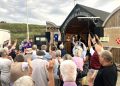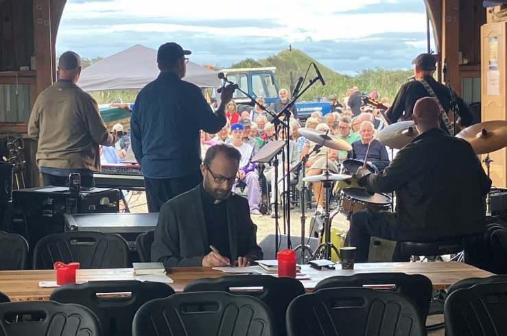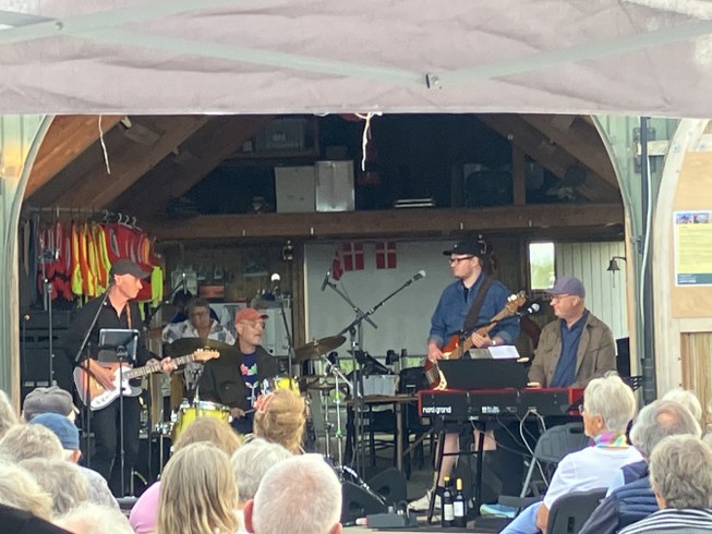 Bandet spillede under tag med de høje porte åbne, og bænkene uden for under Guds smukke himmel var fyldte og stemningen sprudlende. Efter musikken og forkyndelsen samledes man som altid til kaffe og kage i bådhuset.