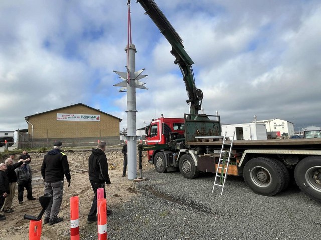 Ved et rejsegilde onsdag eftermiddag blev den nye kompasretterpæl, der er fremstillet af Niels Alfred Larsens Smede- og Maskinværksted i V. Hjermitslev, placeret på Den gamle Bedding på Havnegade med hjælp af en kranvogn og byens gæve Fortovsmatroser.