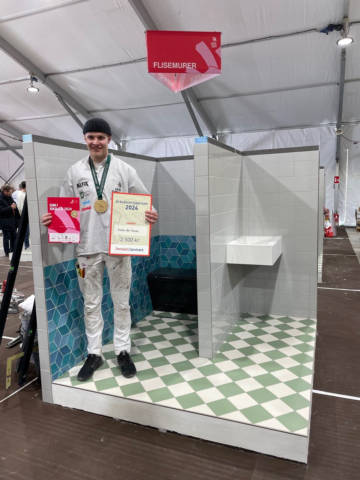 Kristian Bak Hansen fra Hæstrup Murerforretning ApS vandt ikke bare i flisemurerkonkurrencen ved DM i Skills 2024.