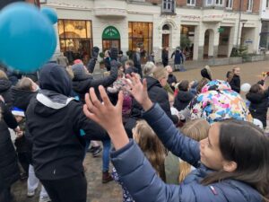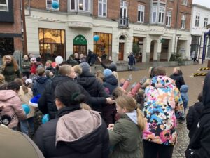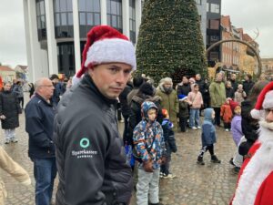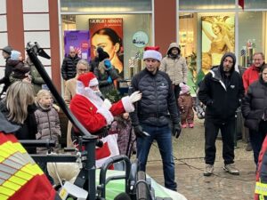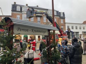 Krumme var i anledning af årstiden forvandlet til Julemand Krumme, og Nissen havde også en stor finger med i spillet. Regionsdirektør hos Sparekassen Danmark, Casper Nissen Larsen, steg sammen med Krumme Julemand ombord i Falcks store Stigevogn og kastede100 balloner ud til børnene.