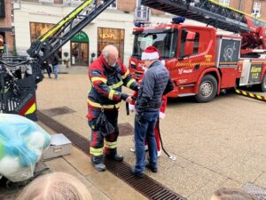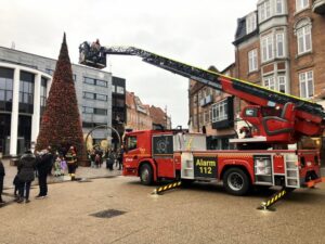 Inden turen til vejrs med udsmiderne havde børnene mulighed for, godt og forsvarligt forsynet med sikkerhedsline, at blive hejst op sammen med de flinke folk fra Nordjyllands Beredskab. Udsigten skulle være rigtig flot over Hjørring i jule-udklædning.