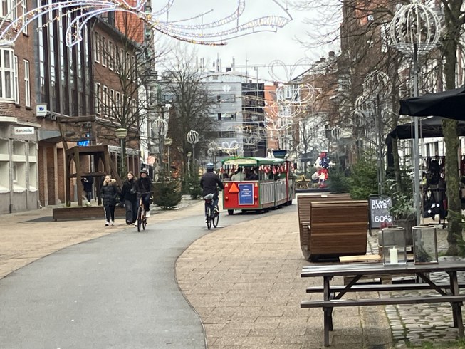 I denne søde juletid må togføreren sno sig forbi det store Kyssetræ på Springvandspladsen og midtbyens øvrige flotte juleudsmykning.