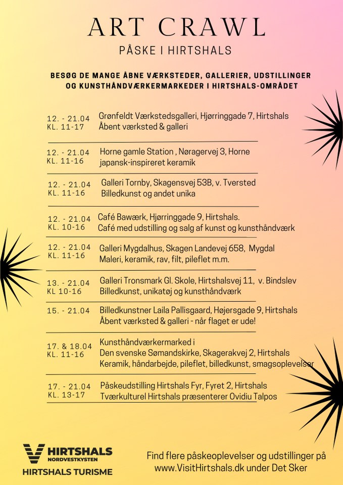 Kunsthåndværkermarkedet er en del af en større påskeoplevelse i Hirtshals-området. Hirtshals Turisme har derfor igen samlet en oversigt – ”ART CRAWL” – der guider dig til endnu flere kunsthåndværkermarkeder, udstillinger, gallerier og åbne værksteder i området.