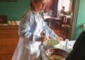 Kl. 13.00: Rød mod blå i kartoffelskrælningskonkurrence på tid i anledning af det forestående kommunalvalg foran husmandsstedet.