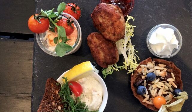 Vi prøvesmagte en meget lækkert Kloster Frokost bestående af hjemmerørt torskemousse med krydderurter, fasanfrikadelle med coleslaw samt dagens skønne dessert.