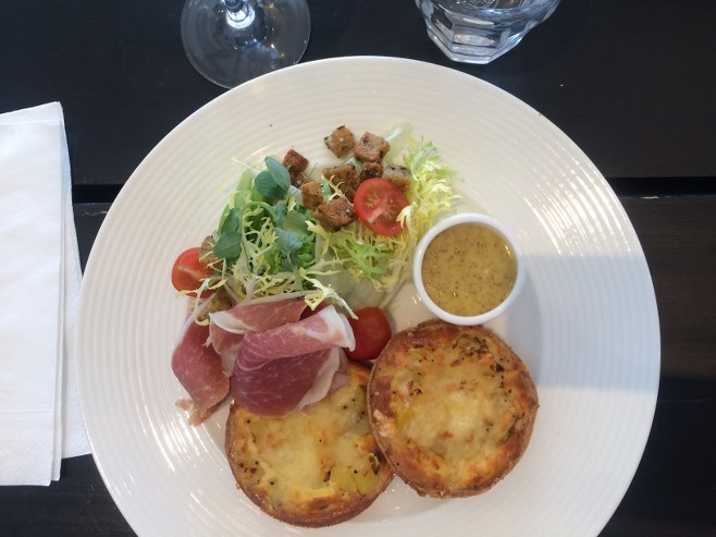 Medspiseren fik Elsebeths Tærte bestående af Quiche med kartofler, løg og ost serveret med lufttørret skinke og sprød salat med hjemmerørt vinaigrette. Meget delikat og velanrettet. Den kan også vælges vegetarisk.