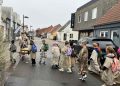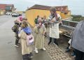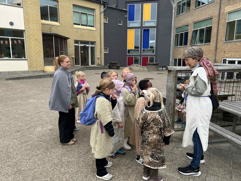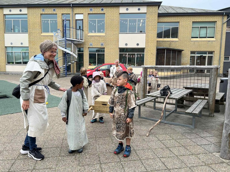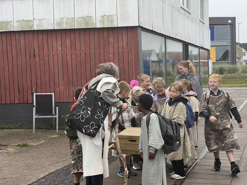 Da tiden kom, blev børnene og deres lærere klædt ud i fine dragter, og turen gik i gang – med Mosesvandringen som ramme. Undervejs blev Pagtens Ark båret på skift, og Anne Gerda fortalte levende og engageret om Moses og israelitternes rejse. Hun inddrog børnene hele vejen igennem, og det skabte et nærvær og en spænding, der holdt, selv når regnen silede eller omgivelserne bød på små forstyrrelser.