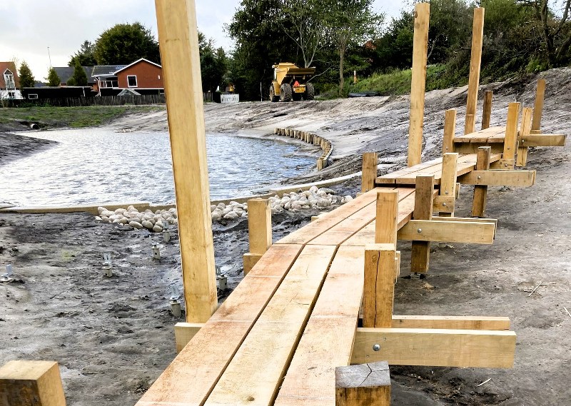 Midt i det hele er Per Molsen i gang med at opføre en flot bro i træ, der elegant svinger ud over vandet. Men broen er mere end blot en passage, idet den med sine varierende niveauer, stolper og forlængede bjælker er designet til at inspirere til bevægelse og fysisk udfoldelse.