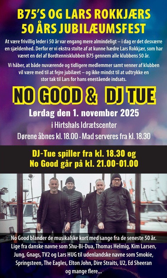 - Kl. 12.15: Receptionen starter i B75’s spillelokaler. Køkkenet i Hirtshals Idrætscenter serverer mad, og der er mulighed for, at alle der har lyst, kan tage ordet.