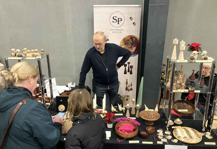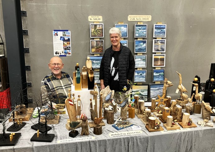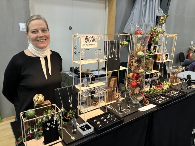 Lisa Dissing fra Hjørring har på julemarkedet et spændende udvalg af sine flotte unika smykker, og fra Tårs pyntede Galleri Ringtved også flot på messen.