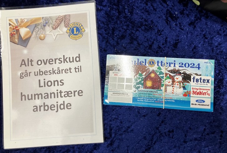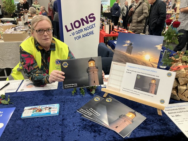 Lions sælger på julemarkedet blandt andet årskalender med smukke billeder af Erik Bilde, de sælger egen bjesk med navnet Skipper Clement Laugets Bjesk, og de sælger lodsedler til årets store julelotteri med gevinster for over 45.000 kroner.