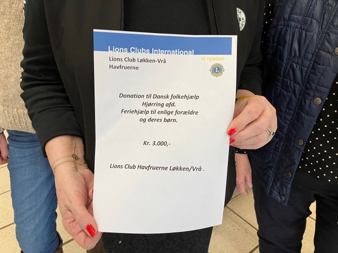Lions Club Løkken-Vrå Havfruerne overrakte onsdag Jette Videnkjær fra Dansk Folkehjælp Hjørring 3000 kroner som støtte til det humanitære arbejde i Hjørring kommune.