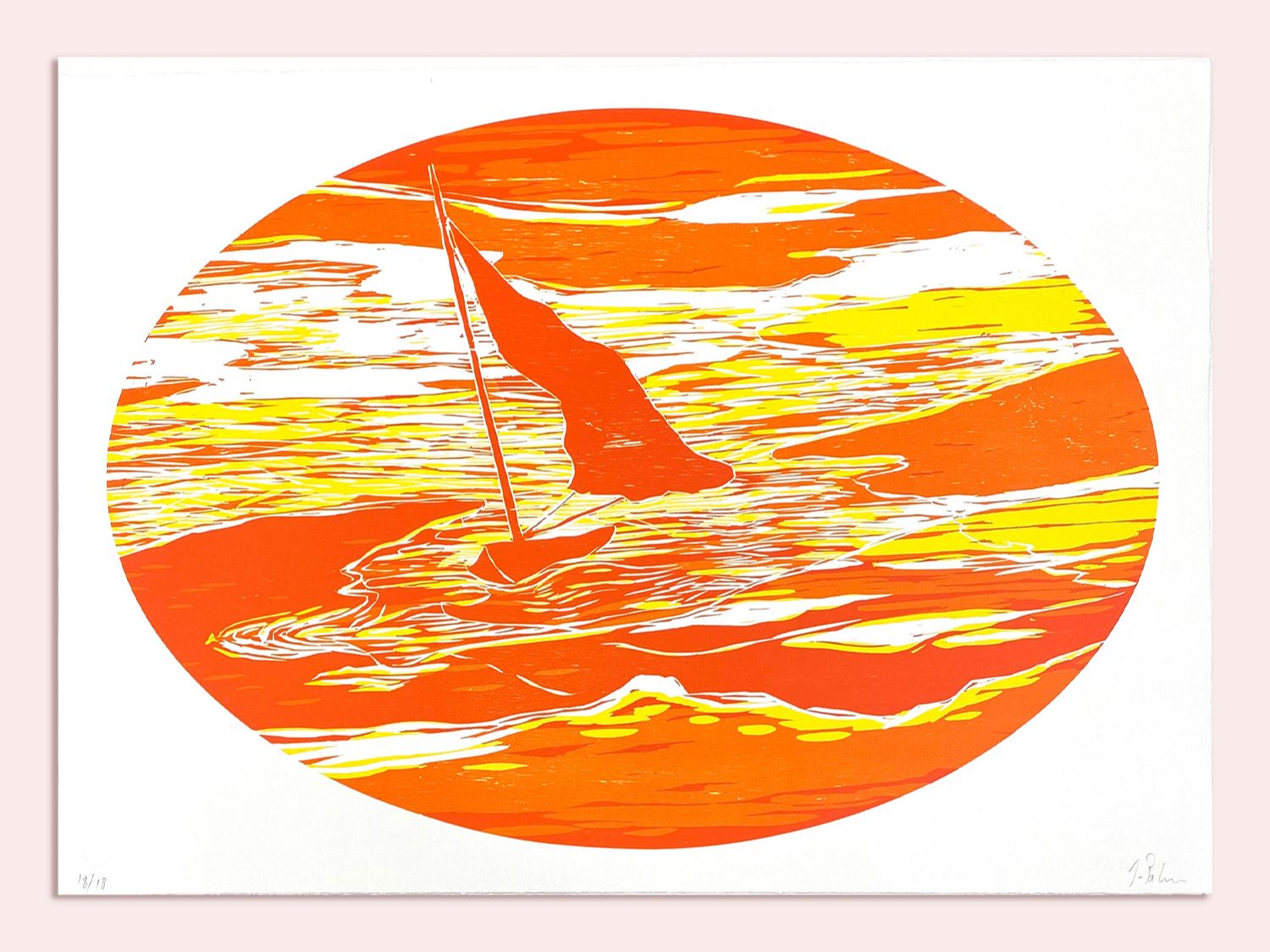 Jesper Palm har arbejdet på værkstedet med tre nye reduktions-træsnit i ovalt format. Med titlerne “Gul flod”, “Rødt hav” og “Turkis delta” invitere kunstneren ind i sine drømmende landskaber, hvor du som beskuer er den eneste tilstede.