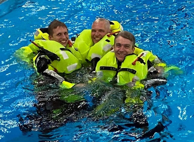 Allan Jellesen, Michael Søborg og Henrik Ledet fra Hirtshals Redningsstation deltager i disse dage på Kystredningstjenestens Basisuddannelse. På kursets første dag blev der prøvet kræfter med fysiske udfordringer i Søværnets Sergentskoles svømmehal i Frederikshavn.