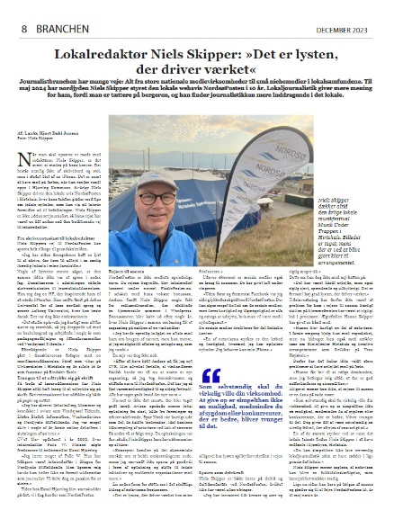 Når man skal opsætte et møde med redaktøren Niels Skipper, er det svært at mødes på hans kontor. Det består nemlig ikke af skrivebord og stol, men i stedet blot af en iPhone. Det er nemt at have med på farten, når han render rundt oppe i Hjørring Kommune. 61-årige Niels Skipper driver den lokale avis NordsøPosten i Hirtshals, hvor hans telefon gløder med tips om lokale nyheder, som han via sit talerør formidler ud til befolkningen. Niels Skipper er ikke uddannet journalist, så hans rejse har været en lidt anden end den traditionelle vej til lokalredaktør.