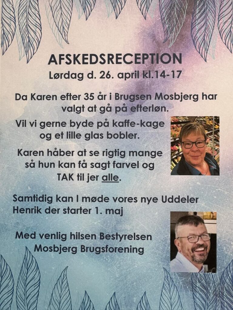 Kom forbi Brugsen i Mosbjerg på lørdag og vær med til at sige tak til Karen og goddag til Henrik.