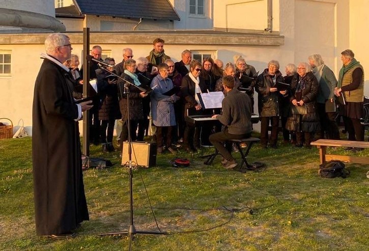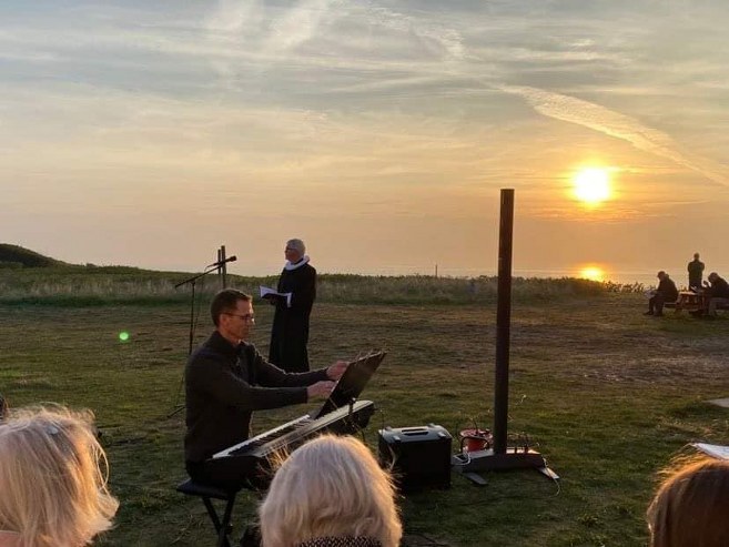 Kirkens Voksenkor medvirkede og sang bl.a. meget rammende ‘Et hav, der vugger sig til ro nu’, mens alle selvfølgelig fik mulighed for at synge med på et par samler under kyndig musikledsagelse af Anton Schmidt-Jakobsen.