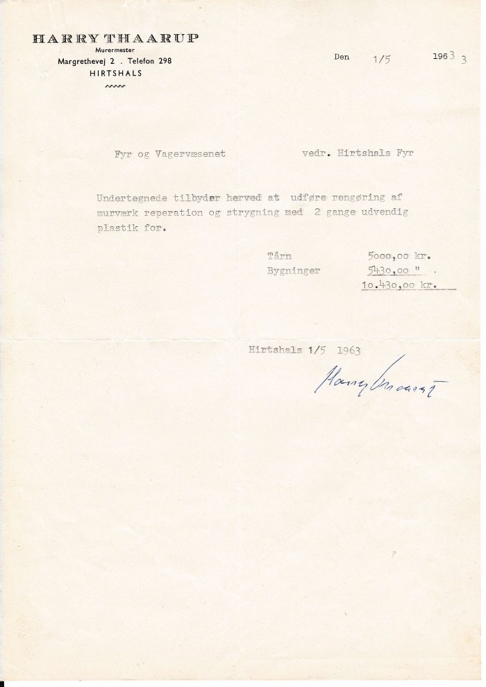 I 1963 fik man også malet Tårnet. Forud for arbejdet havde Murermester Harry Thaarup afgivet et overslag på 5000 kr, for arbejdslønnen, da Fyrvæsenet selv havde lade indkøbe 275 kg malingpasta, som var blevet leveret pr. bane!!. (med toget), noterer Peter Jensen.