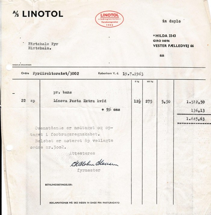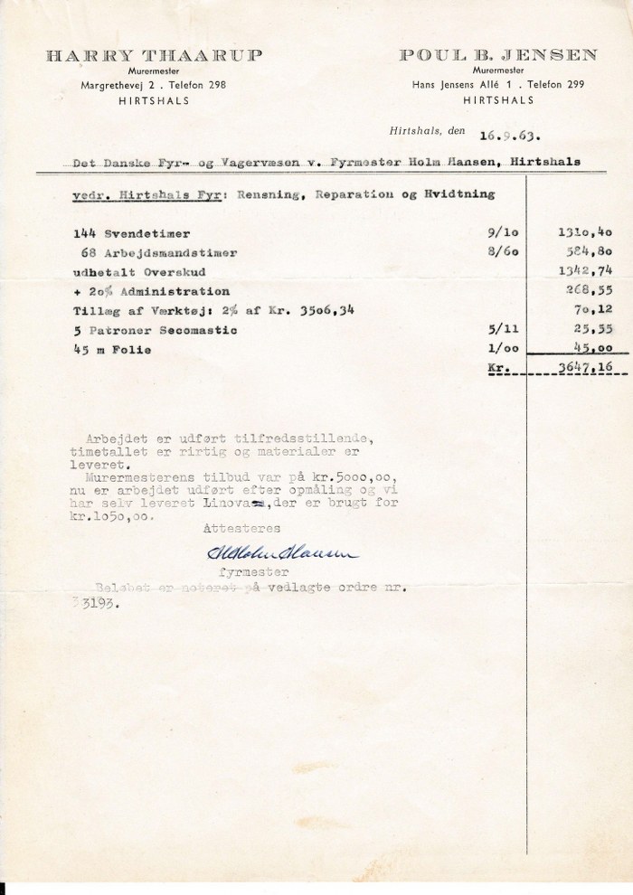 Da arbejdet var tilendebragt, blev det opmålt og det viste sig at det afgivne overslag lagde over den faktiske regning på kr. 3647.16,- og forbruget af fyrets egen indkøbte maling beløb sig til ialt kr. 1050,- . 144 svendetimer a kr. 9.10,- samt 68 arbejdsmandstimer a kr. 8.60, slutter formanden fra Støtteforeningen Hirtshals Fyr.