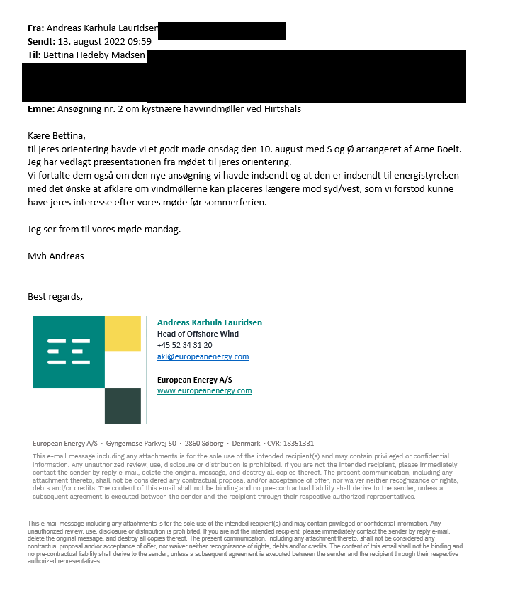 Oprindeligt havde European Energy kun en ansøgning, som potentielt kan give mulighed for at opstille 350 MW vindmøller udfor Hirtshals Havn. Men som mailen nedenfor viser, var det på forvaltningens opfordring at European Energy valgte at indsende ansøgning nr. 2 til Energistyrelsen.