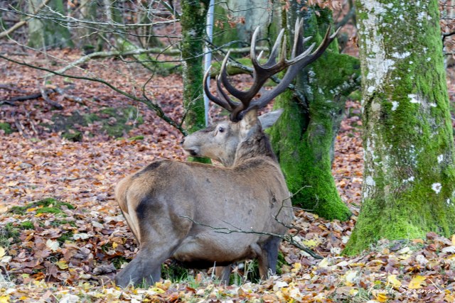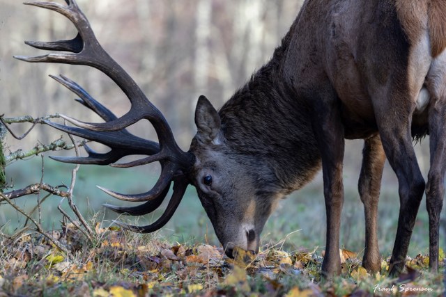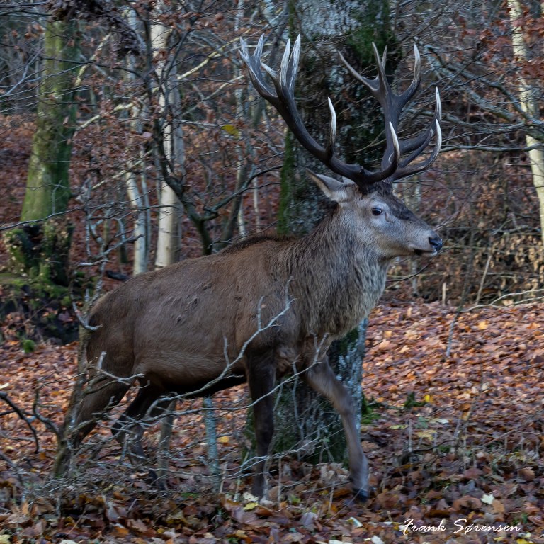 Den lokale naturfotograf Frank Abildgaard Sørensen har fanget et af disse majestætiske dyr, der viser både styrke og ro. På billederne ses kronhjorten med imponerende gevir, der vidner om alder og dominans. Hvert af billederne indrammer smukt skovens efterårsstemning og kronhjortens naturlige adfærd.