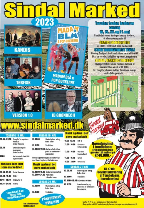 Igen i år har arrangørerne fornøjelsen at invitere dig og hele din familie til hele Nordjyllands familiemarked i Sindal. I 2022 gæstede rigtig mange Sindal Marked. Det håber vi alle vil gentage sig i dagene fra torsdag den 18. maj til og med søndag den 21. maj 2023. Boderne åbner klokken 10 torsdag og de øvrige dage klokken 9.