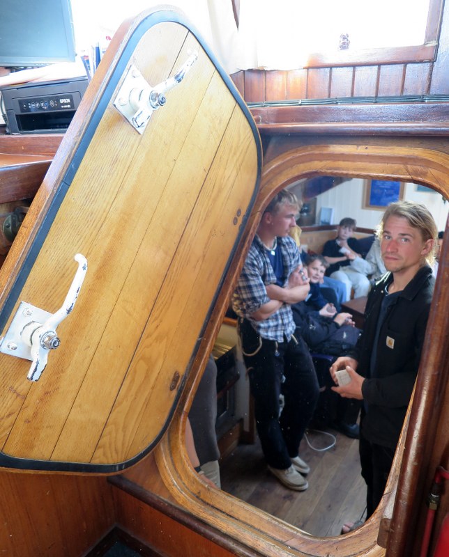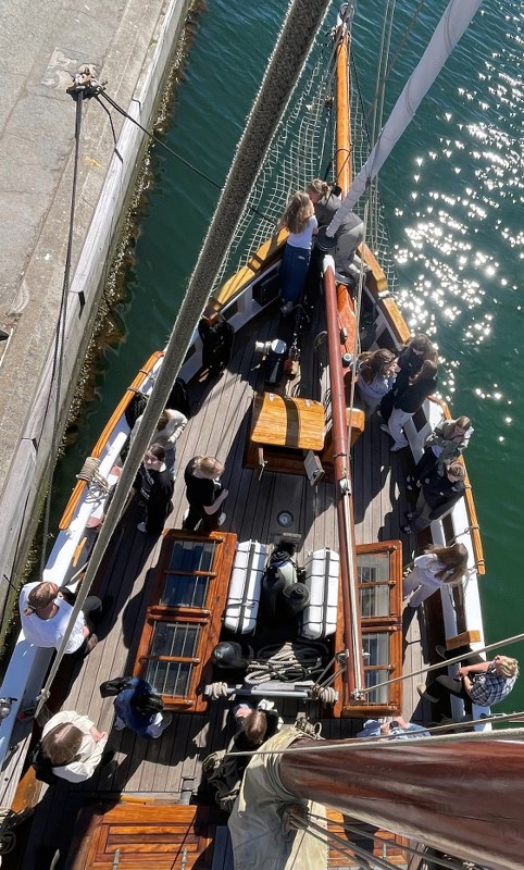 – Godt 17 drenge og 17 piger fik rundvisning og storytelling af skibets ejer Christopher Malmos, og eleverne fik lov at afprøve hvordan et sejl sættes op, fortæller Hanne Magnussen fra MarineShaft.