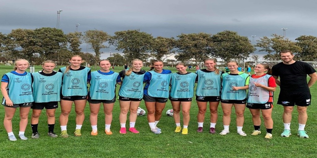 Mark Westergaard på fløjen sammen med sine U19-pigerne – nu er det spillerne i Gjensidige Kvindeliga, han skal arbejde sammen med. Foto: Fortuna.