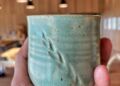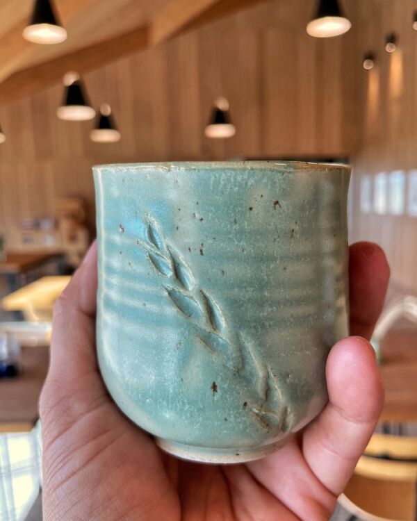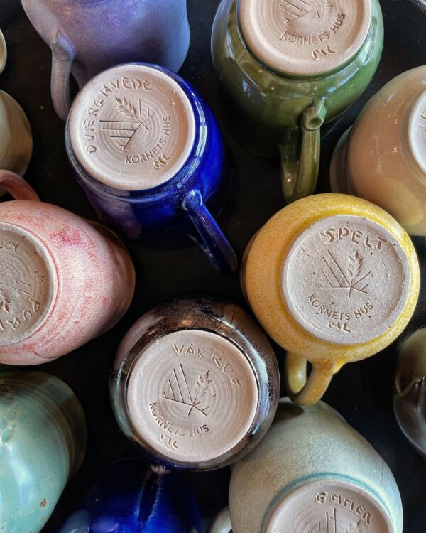 Det er Martha Lundgaard fra KeramikMartha, der drejer kopperne til Kornets Hus. Martha bruger kornaks af mange forskellige sorter fra kornhaven til at lave aftryk på kopperne, inden de brændes og glaseres. Hver kop har derfor sit helt eget, unikke udtryk