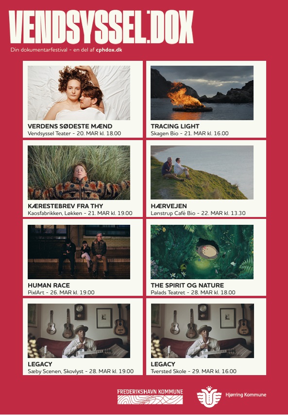 Igen i år er Frederikshavn og Hjørring Kommune tilbage med dokumentarfilmfestivalen, VENDSYSSEL:DOX. Sammen med otte lokale kulturinstitutioner skaber de en filmfestival med et stærkt lokalt afsæt. Fra 20.-31. marts kan man opleve syv dokumentarfilm fra hele verden, udvalgt af de lokale aktører.