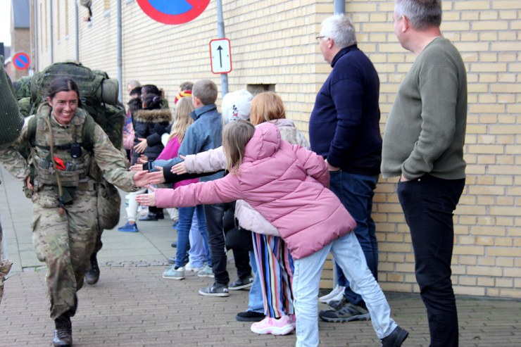 Her blev de klappet igennem gaden, og der blev også uddelt high-fives fra eleverne. Flere gjorde også honnør til militæret, før stroppeturen blev afsluttet ved Hirtshals Fyr.
