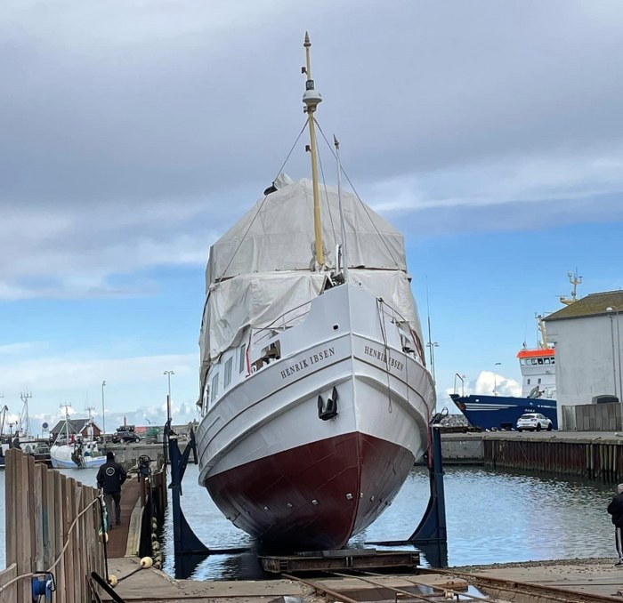 Mandag blev det gode skib M/S Henrik Ibsen søsat efter et tiltrængt og derfor længere ophold på det beddingsanlægget hos Vestkajen Maskinværksted A/S i Hirtshals.