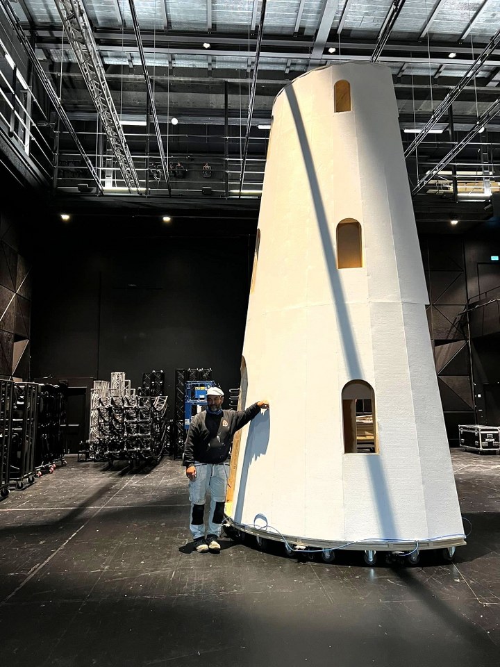 Kopien af Fyret, som tidligere har stået i teatrets værksted, er nu flyttet ind i Store Sal. Og det krævede selvfølgelig en ekspert. Uanset om det er 9 eller 23 meter højt, så gælder det om at tilkalde Kjeld. Heldigvis synes murermesteren selv, at det runde fyr var nemmere at håndtere end det firkantede, han tidligere har flyttet.