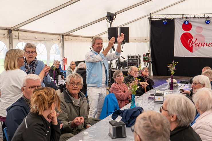 Selvom det regnede da den 15. udgave af Musikfestivalen i Sindal tirsdag blev skudt i gang, vrimlede det med gæster, der glædede sig til tre dage med musik og fællessang. I år er festlighederne rykket fra den vante plæne ved Vendelbocentret til nye rammer ved Ældrecenter Soldalhus, men traditionen og den gode stemning er intakt. Det 540 kvadratmeter store telt var næsten fyldt fra formiddagen, hvor gæster fra nær og fjern var mødt op for at fejre jubilæet.