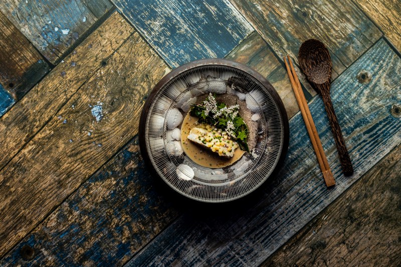 Nam med køkkenchef Kid Khamhomkul og assistent Emil Vestergaard Teijls havde stegt rødspætten til perfektion, tvistet den i deres sædvanlige asiatiske retning og anrettet med blandt andet lokalt avlede krydderurter, som efter pensling med fishsauce og citrus også havde været en tur på grillen.