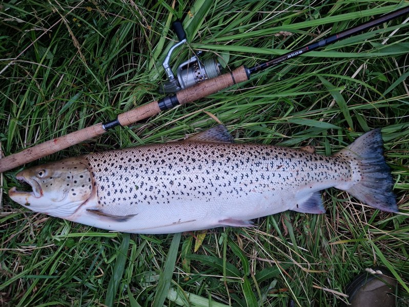 – Jeg listede bag om, hvor jeg stod tidligere på aftenen og kastede den gode, gamle blink ud. Jeg nåede vel at dreje 5 omgange på hjulet, før stangen krøllede totalt sammen. Så for satan tænkte jeg, og så fisken hamre tværs over åen og kastede sig en meter op i luften og landede i et kæmpe plask. Så kørte adrenalinen på fuld hammer og fisken væltede rundt i overfladen og tog flere 20 til 30 meter lange udløb. Vel omkring 20 minutter senere gled fisken langt om længe i nettet, og blinken kom flyvende igennem luften. Føj for pokker for en fight og heldigt blinken blev siddende til den var i nettet, uddyber Michael Ejstrup Nielsen.