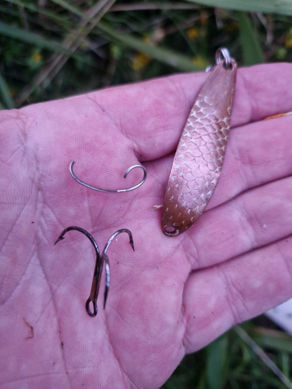 – Jeg gik slukøret videre nedstrøms, hvor det blev til en enkelt mindre bækørred. På vej mod bilen fiskede jeg opstrøms, næsten op til hvor jeg så havørreden. Jeg satte mig ned et stykke derfra og rodede i min grejæske og fandt en gammel Delfin Krokodill blink i kobber, som var blevet helt mørk af at ligge i æsken i 15 år uden at være i brug. Tog lidt jord på fingrene og gnubbede blinken, så kobberfarven blev slebet frem igen, fortæller Michael Ejstrup Nielsen.