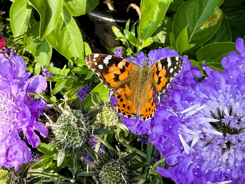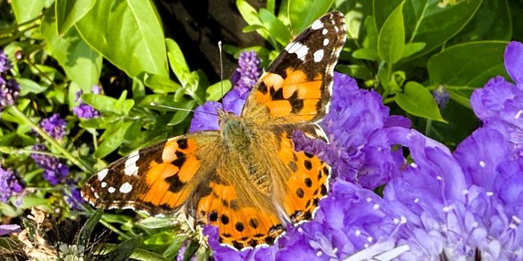 Den flyver mange tusind kilometer fra Nordafrika for at holde sommerferie i Danmark. I denne pinse er flere eksemplarer også i gang med at finde nektar i vores gårdhave.